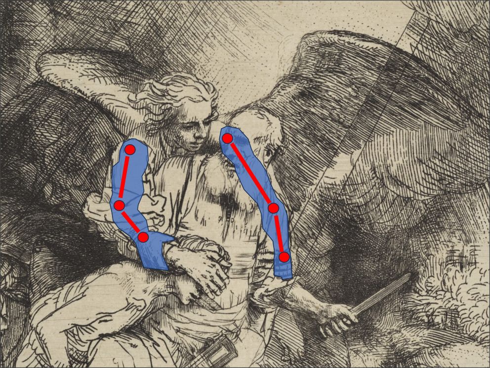 In the Hermitage painting, in which the figures have a different spatial relationship to each other, the anatomic relations seem more “correct”. The angel grabs Abraham’s knife-holding arm and not the arm that holds Isaac’s head as in the Met’s etching.