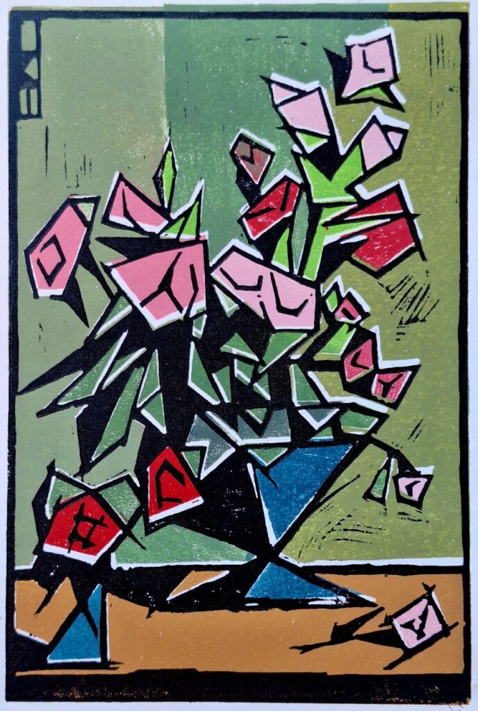 The simplified, angular forms infuse what started out as a simple bouquet of flowers with a certain sense of movement. The asymmetric arrangement and the more or less unintentional white and black stripes and spots also appear to contribute to the liveliness of the print.